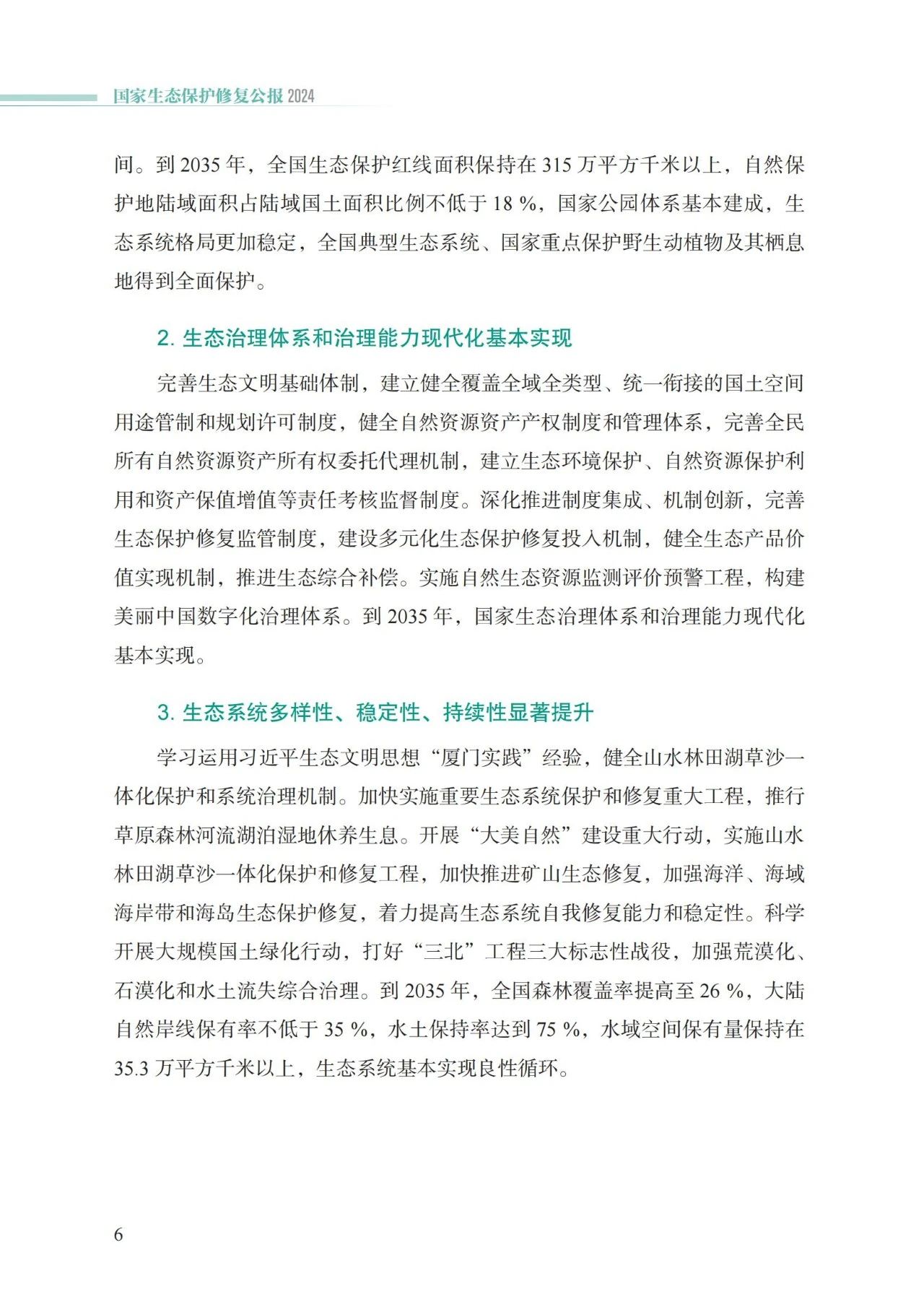《公报》发布了我国严守自然生态安全边界、实施生态修复重大行动、开展生态治理专项行动的进展与成效。其中,“严守自然生态安全边界”主要突出了以高水平保护支撑高质量发展的重要举措,重点是划定并严守生态保护红线、建设以国家公园为主体的自然保护地体系、优化国家重点生态功能区、构建生物多样性保护网络、开展重要生态空间自然资源确权登记、强化自然生态空间用途管制、促进生态产品价值实现、加强自然生态监管和执法督察等全链条管理的重要进展;“实施生态修复重大行动”主要突出了久久为功建设“大美自然”,全方位、全地域、全过程、全要素推进生态保护修复的明显成效,发布了实施山水林田湖草沙一体化保护修复、推进历史遗留废弃矿山生态修复、实施海洋生态保护修复、打好“三北”工程攻坚战等重大行动的重要进展;“开展生态治理专项行动”发布了重要生态系统保护和修复重大工程、国土绿化、全域土地综合整治、巩固提升生态系统碳汇能力、生态灾害防治等专项行动的重要进展。