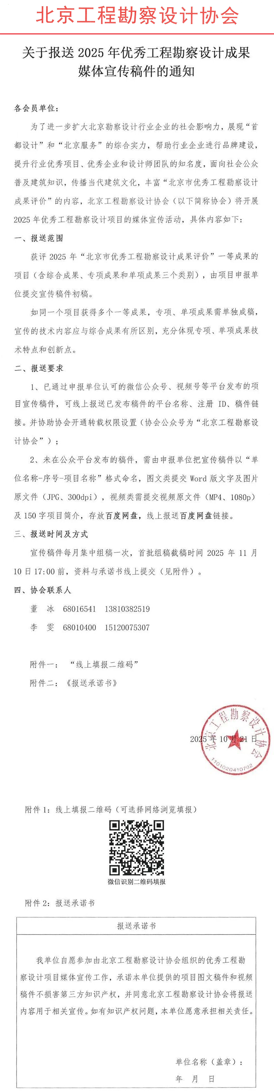 我单位自愿参加由北京工程勘察设计协会组织的优秀工程勘察设计项目媒体宣传工作,承诺本单位提供的项目图文稿件和视频稿件不损害第三方知识产权,并同意北京工程勘察设计协会将报送内容用于相关宣传。如有知识产权问题,本单位愿意承担相关责任。