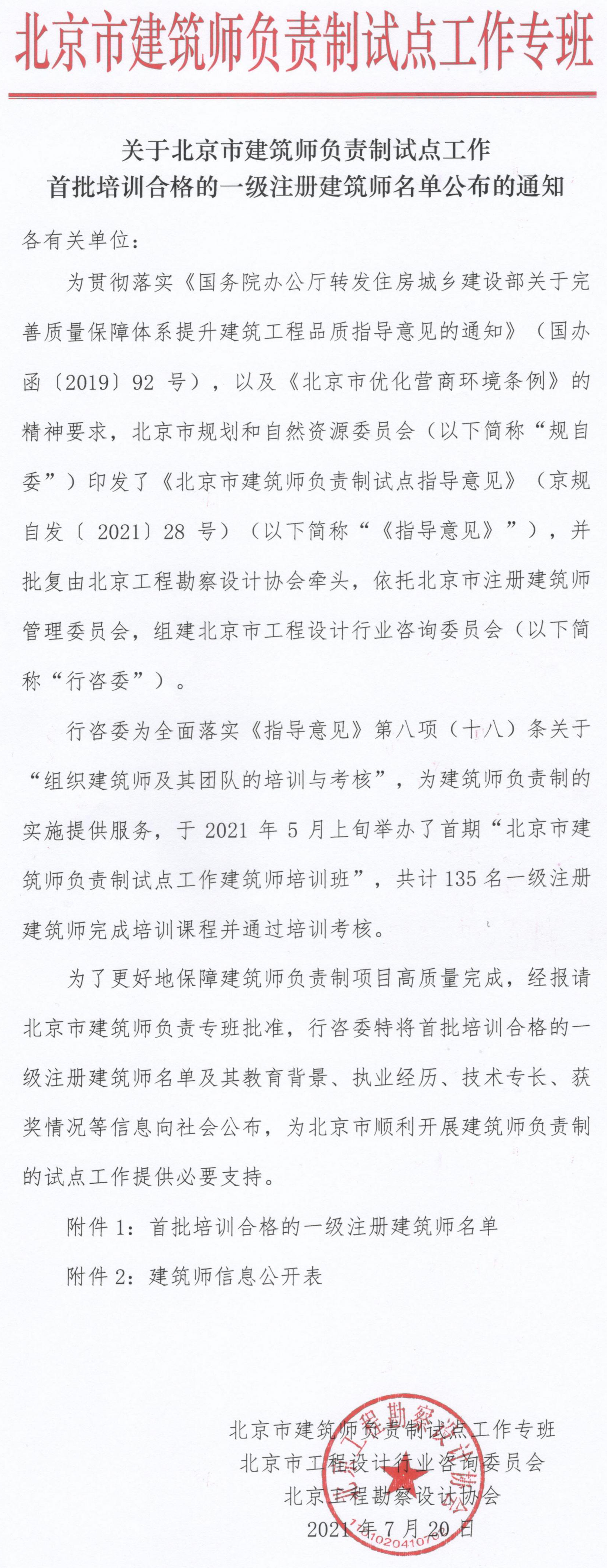 为了更好地保障建筑师负责制项目高质量完成,经报请北京市建筑师负责专班批准,行咨委特将首批培训合格的一级注册建筑师名单及其教育背景、执业经历、技术专长、获奖情况等信息向社会公布,为北京市顺利开展建筑师负责制的试点工作提供必要支持。