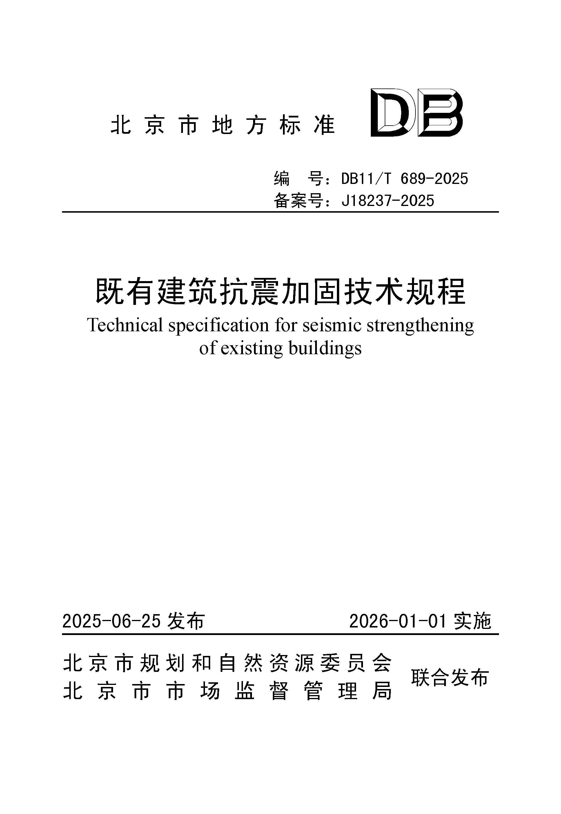 《既有建筑抗震加固技术规程》(DB11/T 689-2025)自2026年1月1日起实施,自实施之日起,请各单位在开展北京市行政区域内既有建筑的抗震加固设计、施工及验收工作中按照本规范认真执行。