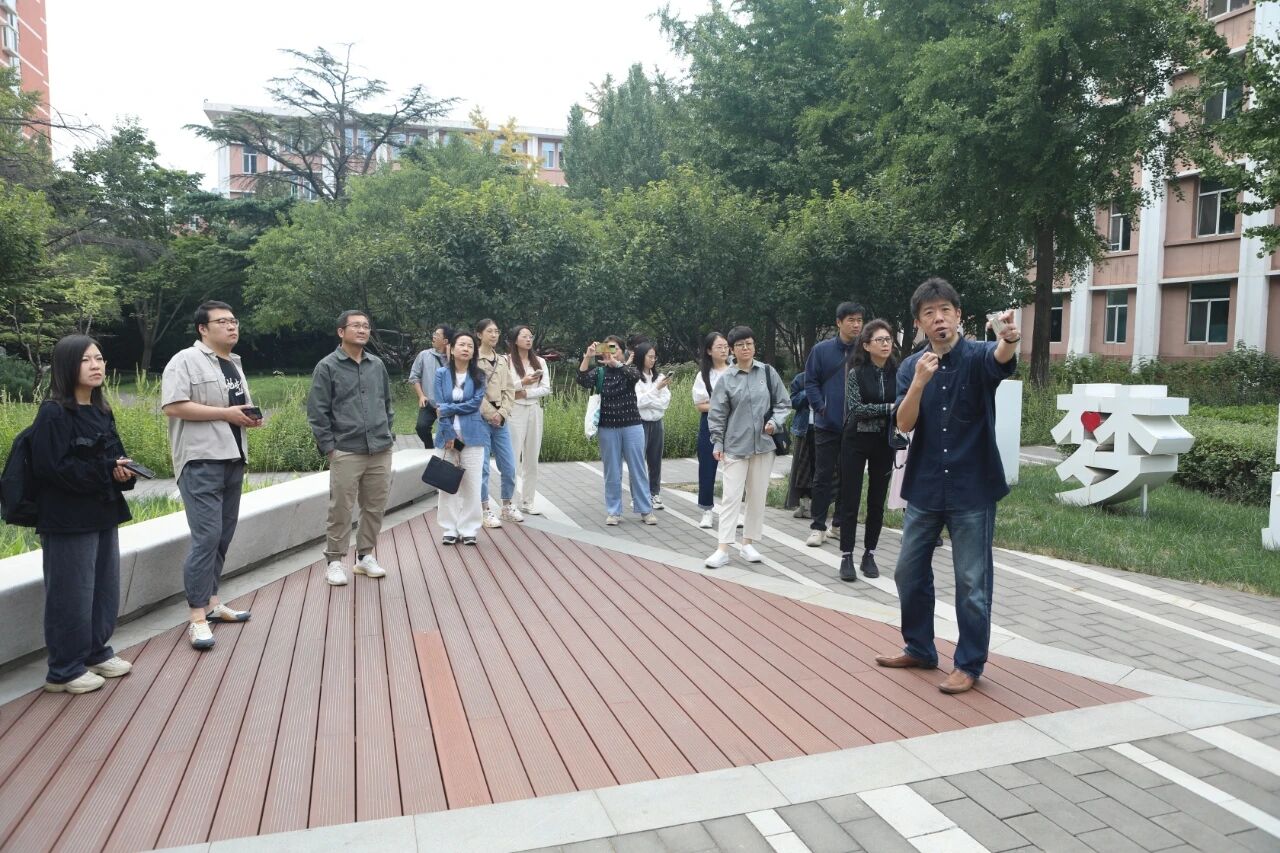在傅绍辉的带领与讲解下,大家以公司A座办公楼为案例进行了现场研学,从空间布局到细节设计逐层深入,了解A座办公楼在建筑、景观、结构、绿色和智慧等方面的设计理念与技术特点。