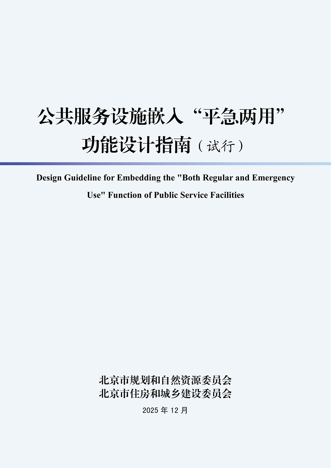 为规范和指导本市“平急两用”公共服务设施的规划与建设,增强城市安全韧性能力,按照《关于印发“平急两用”公共基础设施建设总体实施方案2025年任务清单的通知》(京发改〔2025〕531号)的要求,市规划自然资源委会同市住房城乡建设委研究制定了《公共服务设施嵌入“平急两用”功能设计指南(试行)》(以下简称《指南》)。本《指南》自发布之日起实施,试行有效期3 年。