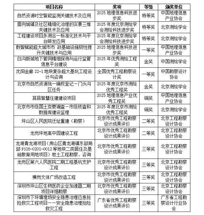 由建设综合勘察研究设计有限公司王丹大师工作室领衔的时空信息创新发展研究中心,精准锚定时空信息科技创新赛道,持续深耕钻研,取得了斐然的成果:其承建的“白沟新城地下管网精细探测与运行监管信息平台建设”项目以及“面向城镇及社区精细化治理的实景三维关键技术及应用”项目,分别荣获中国测绘学会科学技术奖优秀工程金奖、北京测绘学会科技进步特等奖;与武汉大学等单位合作完成的“自然资源时空智能监测关键技术及应用”项目,以及与北京市测绘设计研究院等单位合作完成的“数智赋能超大城市市政基础设施韧性提升关键技术与应用”项目,作为新业态的突破性成果,先后荣膺中国地理信息产业协会地理信息科技进步奖特等奖和一等奖。这些成就充分彰显了中心在测绘地理信息技术创新与实践应用领域强大的综合实力,为行业的高质量发展贡献了坚实的力量。