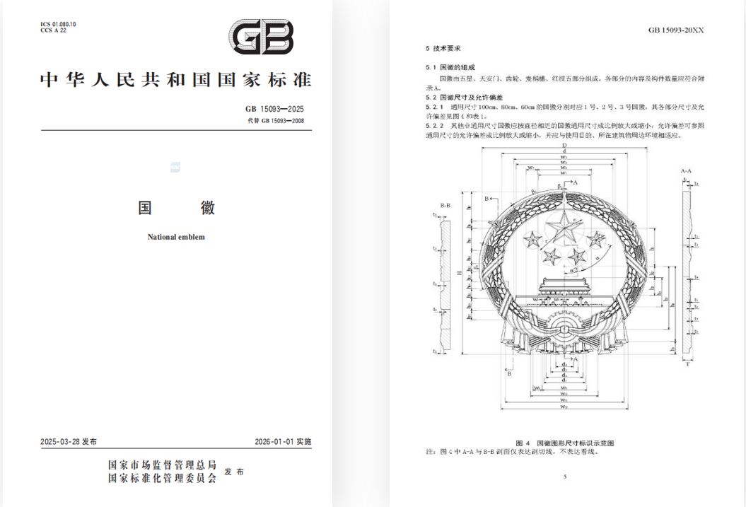 4)参编国家标准《国徽》,于2025年3月28日发布,2026年1月1日实施;