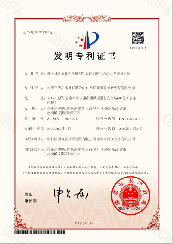 ▶ 2025年10月,中科设计与永康钱江水务联合研发的基于CFD的氧化沟优化方法系统获国家发明专利授权。