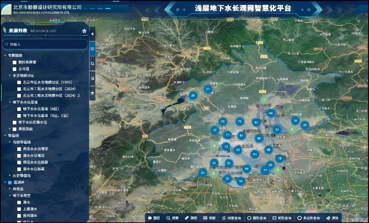 经过七十余年建设,北勘院打造的北京地下水监测网已经覆盖整个北京平原区,千余口监测井按含水层分层布设,平均每100平方公里就有15个监测点,从浅层地下水到城市重点风险区域实现全覆盖。