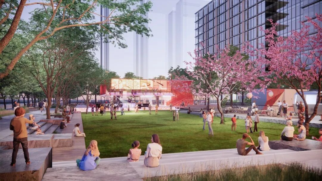 集中绿地位于地块东南角,设置了大吉魔方科技之门、低碳花园、能量体验馆、草坪剧场、森林露台等,与地块东南侧的社区集中绿地连为一体,还绿于民,打造健康、节能为主导的时代办公产品和兼具城市记忆、城市生态与城市活力的都市绿地花园,为市民提供了多维度活动空间。