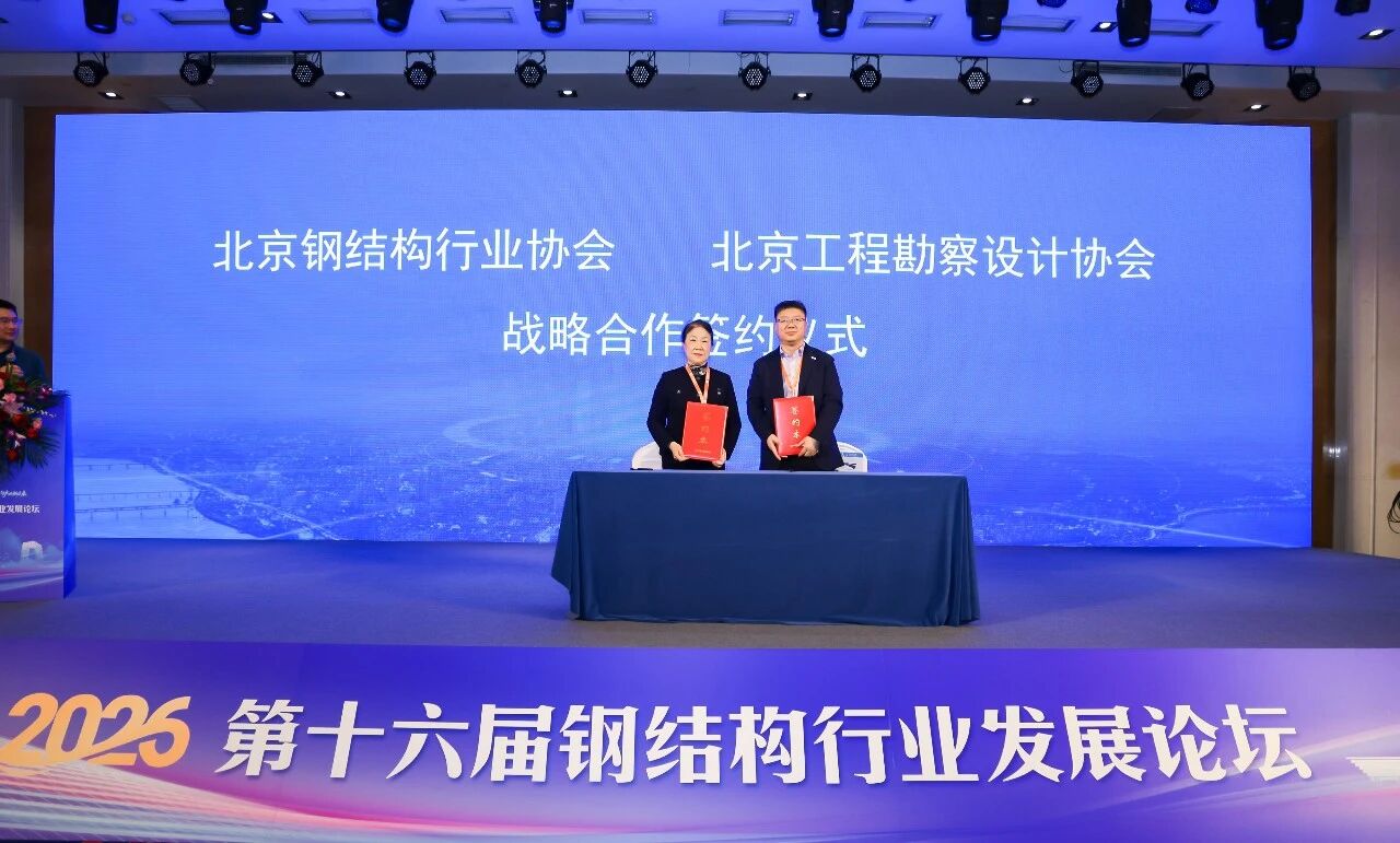 论坛上,北京钢结构行业协会与北京工程勘察设计协会举行了战略合作签约仪式。北京钢结构行业协会副会长兼秘书长常海君,北京工程勘察设计协会副会长兼秘书长胡颐蘅作为双方代表上台签约,全场以热烈掌声共同见证这一重要时刻。此次两大协会携手合作,以推动行业高质量发展和会员企业提质增效为核心,重点开展两方面合作:一是深化会员单位上下游协同,通过搭建会员对接机制,组织学术交流、技术研讨及培训等活动,推动会员建立合作关系,精准匹配设计需求与钢结构产品,切实解决行业痛点;二是共同助力会员企业海外发展,联合组建海外发展服务平台,整合多方资源,为会员提供全方位服务,对接“一带一路”等新兴市场需求。